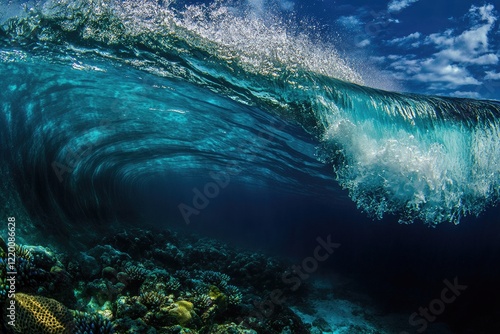 Obraz premium A powerful ocean wave cresting over a rocky underwater reef, colors shifting...
