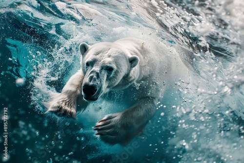Fototapeta premium A powerful polar bear dives energetically into the cold Arctic waters,...