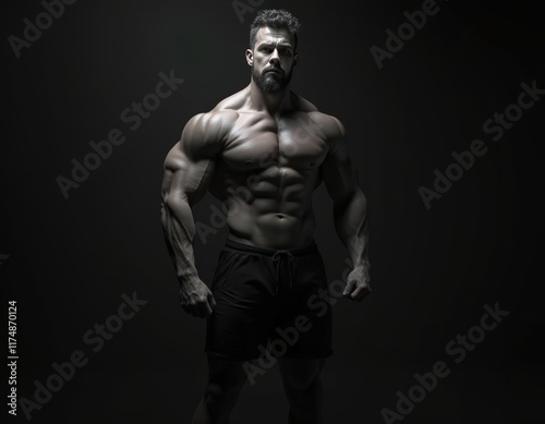 © Muhammad, Naklejka premium A Powerful Portrait: Muscular Man Posing Against a Dark Background, Displaying Strength, Fitness, and Athleticism. A Dramatic Studio Shot Emphasizing Physical Conditioning and Bodybuilding.