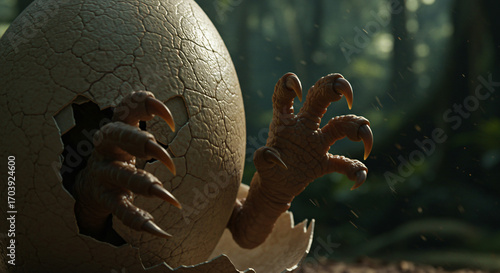 Naklejka premium A powerful prehistoric dinosaur hatchling with sharp claws breaks free from its egg in a lush, ancient jungle environment