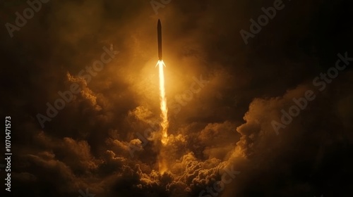 Obraz premium A powerful rocket launches into the sky through a cloud of smoke and fire,...