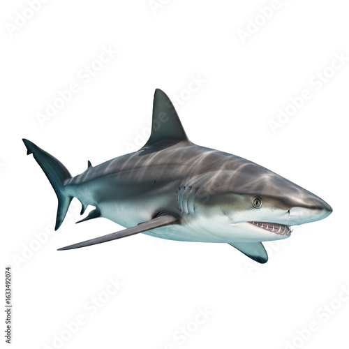 Fototapeta premium A powerful shark swims gracefully underwater, its sleek body and sharp teeth visible, representing ocean life.