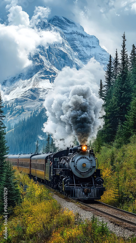 Obraz premium A powerful steam train makes its way through the Canadian Rockies, leaving a...