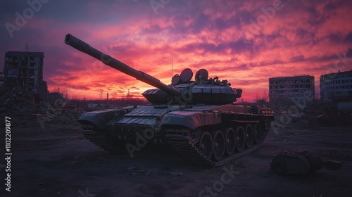 Naklejka premium A powerful tank stands tall against a stunning sunset sky. Abandoned buildings create a dramatic backdrop for this military vehicle.