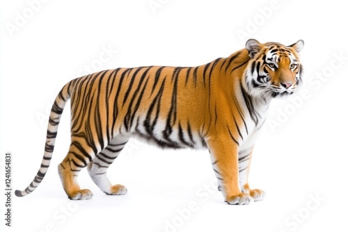 Fototapeta premium A powerful tiger stands tall against a white backdrop, its intense gaze fixed...