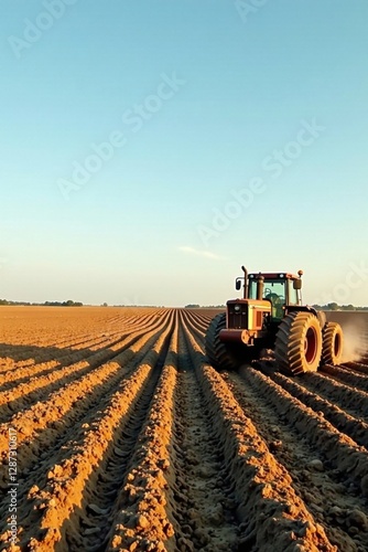 © napak, Fototapeta premium A powerful tractor cultivates a vast field, preparing the fertile soil for planting under a clear, expansive sky, showcasing the agricultural process in its glory.