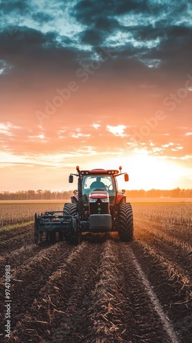 Fototapeta premium A Powerful Tractor Cultivates the Land at Sunset, Leaving a Trail of Hope in...