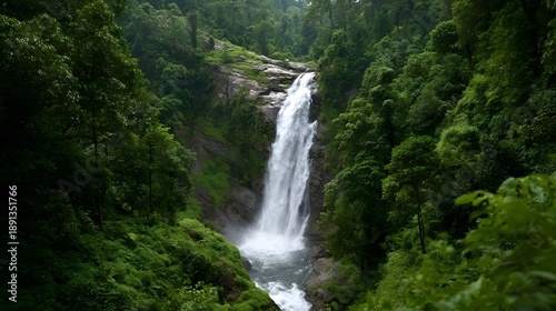Fototapeta premium A powerful waterfall cascades down a rocky cliff within a dense lush green...