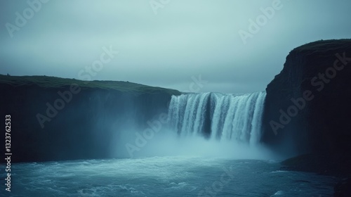 Fototapeta premium A powerful waterfall cascades over a cliff, enveloped in mist and framed by...