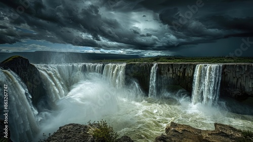 Fototapeta premium A powerful waterfall during a rainstorm, with dark clouds overhead and the...