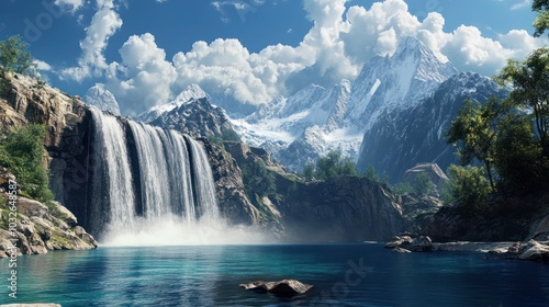 Fototapeta premium A powerful waterfall flowing into a deep blue lake, with snow-capped...