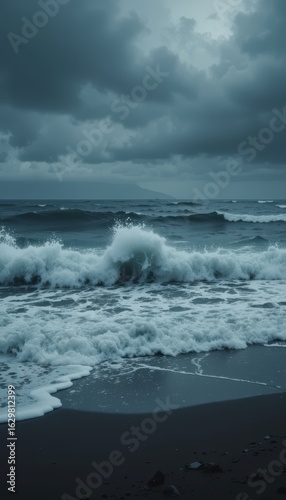 © Marco, Fototapeta premium A powerful wave crashing on a dark beach on a stormy day