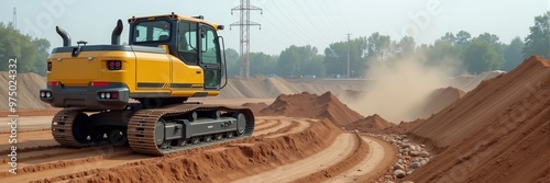 Fototapeta premium A powerful yellow bulldozer working on a construction site, moving earth and...