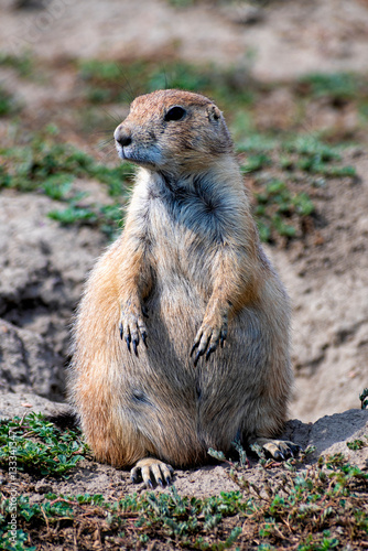 © Valerii, Naklejka premium A prairie dog stands upright in its natural environment, showcasing its adorable features and inquisitive nature, embodying the charm of this small yet captivating mammal.