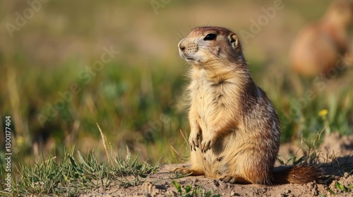 Naklejka premium A prairie dog stands upright on a mound, attentively scanning its surroundings. Sunlight highlights its soft fur while the blurred grassy background adds depth,