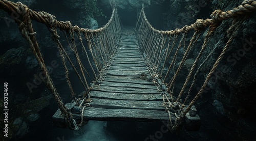 Fototapeta premium A precarious rope bridge stretches across a dark chasm, its weathered wooden...