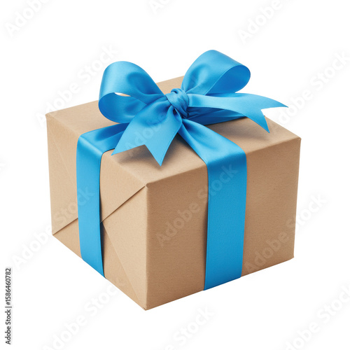 Obraz premium A precise rectangular gift box, natural brown kraft paper, vibrant light blue satin ribbon and bow, isolated on a pristine transparent studio background with soft illumination, no shadows, and ample