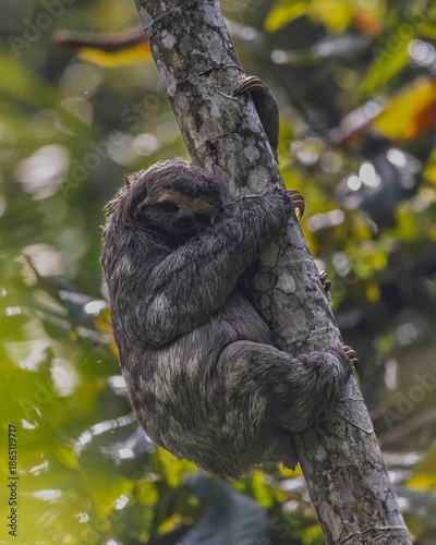 Naklejka premium A pregnant sloth is climbing a cecropia tree.