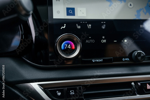 © ARTUR, Fototapeta premium A premium, modern brown car interior, leather steering wheel, large navigation screen, air ducts, deflectors on the car panel. Interior details.