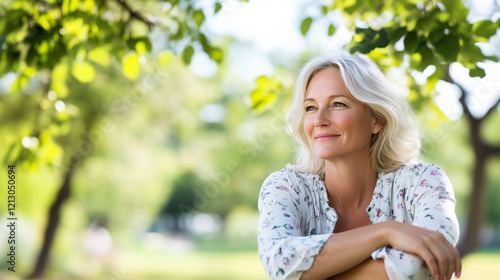 Naklejka premium A pretty blonde woman relaxing in the park, enjoying the fresh air and...