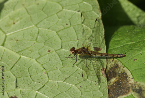 © Sandra Standbridge, Fototapeta premium A pretty Common Darter Dragonfly, Sympetrum striolatum, perched on a Comfrey plant leaf.