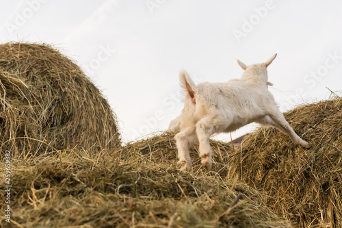 Fototapeta premium A pretty little white goat jumping on a haystack