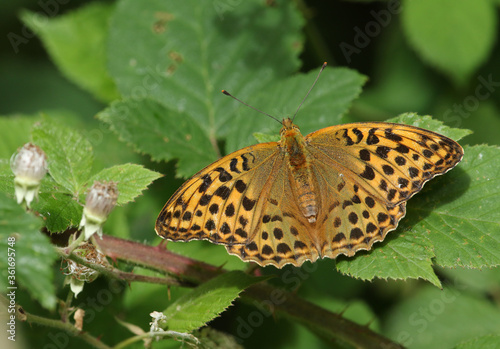 © Sandra Standbridge, Obraz premium A pretty Silver-washed Fritillary Butterfly, Argynnis paphia, resting on a bramble leaf.