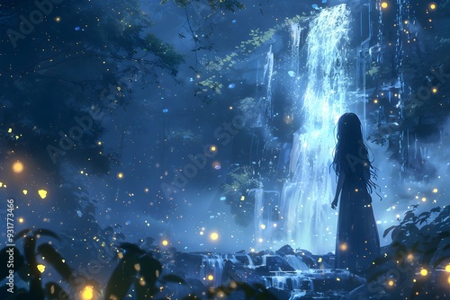 Fototapeta premium A pretty woman with blue hair stands by a waterfall at night with fireflies in the background.