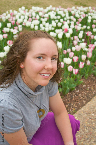© Samuel Perry, Fototapeta premium A pretty young girl poses in front of early spring flowers