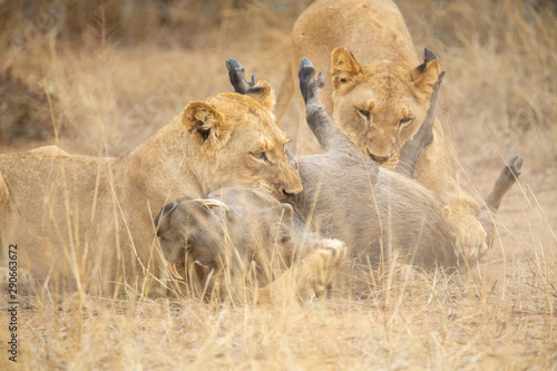 © Darrel, Naklejka premium A pride of three young female lions killing a warthog