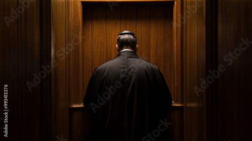 Naklejka premium A priest wearing a black robe stands inside a wooden confessional booth,...