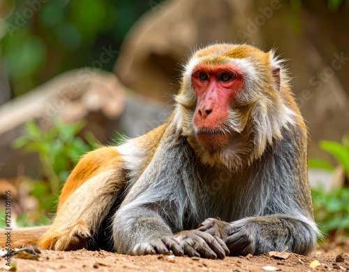 © telo, Naklejka premium A primate rests on the ground, gazing intently