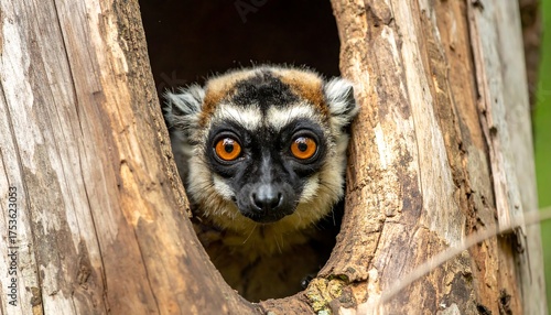 © Babang, Naklejka premium A primate with striking orange eyes peers from a hollow in a weathered tree trunk. Its fur is a mix of brown, tan, and black. The soft background is blurred