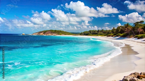 Obraz premium A pristine beach with turquoise waves lapping the shore.