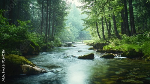 © tharushi, Obraz premium A pristine forest landscape with crystal-clear rivers and abundant flora, on blurred background