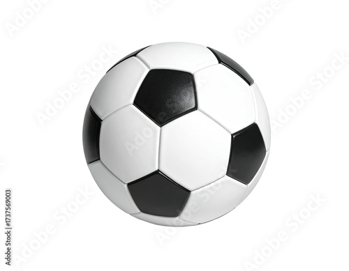 © Delon, Obraz premium A pristine soccer ball with black and white panels isolated against a black background