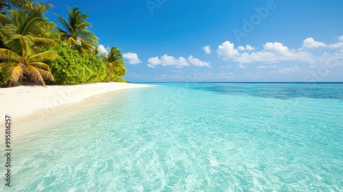 Fototapeta premium A pristine tropical beach features soft white sand and crystal-clear turquoise water under a sunny blue sky, perfect for a getaway