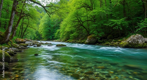 © adobesantren, Obraz premium A pristine turquoise river flows through a lush green forest with mossy rocks on the banks.