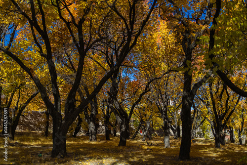 © Sandeep, Fototapeta premium A pristine view of trees with yellow golden leaves during autumn season and sunrays falling on them.