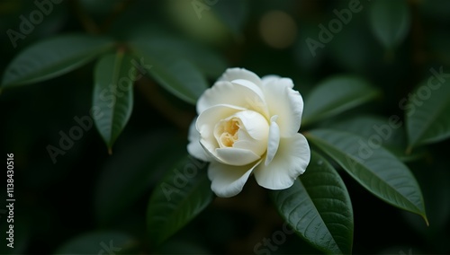 Fototapeta premium A pristine white camellia, delicately blooming amidst lush, dark green...