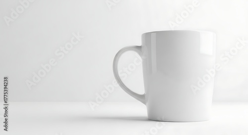 Fototapeta premium A pristine white ceramic coffee mug stands elegantly on a light, minimalist...