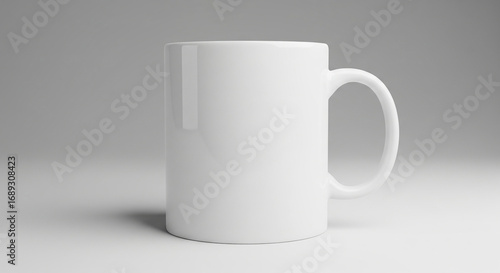 © Paylopi, Fototapeta premium A pristine white ceramic coffee mug with a handle, standing on a reflective surface against a soft grey background.