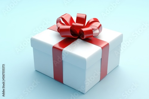 Obraz premium A pristine white gift box adorned with a vibrant red ribbon and bow resting on a soft blue surface