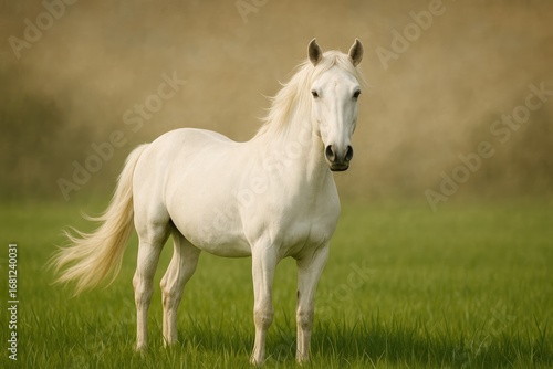 © VRVisionary, Fototapeta premium A pristine white horse grazing in an open field