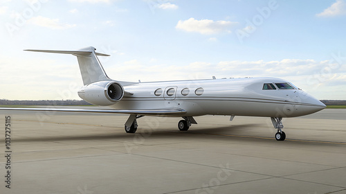 © GoldPumaze, Naklejka premium A private jet parked on a tarmac ready for departure.