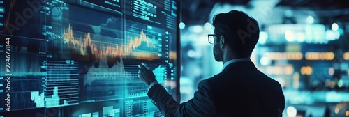 © Naru, Fototapeta premium A professional analyzing digital financial data on a screen, embodying concepts of innovation, technology, finance, analysis, and strategy.