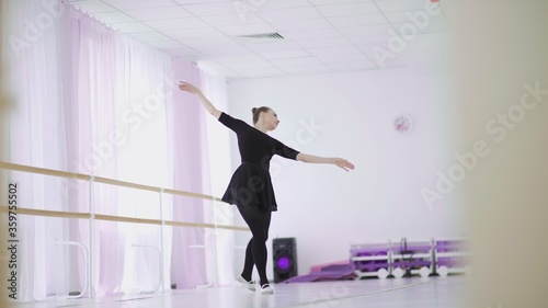 Fototapeta premium A professional ballerina in a black pack dances in a large training hall