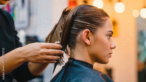 Fototapeta premium A professional hairstylist uses a comb to section and style a client's...