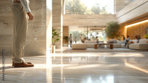 © Рудой Максим, Obraz premium A professional man stands in a modern lobby with natural light streaming in during the day