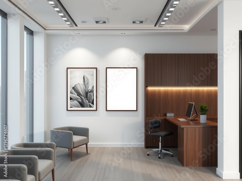 Fototapeta premium A professional office interior showing a mockup of wall art displayed, modern, template, wall art